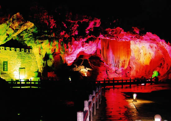 奇梁洞位于縣城北四公里處,屬典型的碳酸鹽巖洞,該洞以奇、秀、闊、幽四大特色著稱。洞長(zhǎng)6000余米,共分五大景區(qū):即古戰(zhàn)場(chǎng)、畫廊、天堂、龍宮和陰陽河。洞中有山,奇梁洞圖片山中有洞,洞洞相連。它集奇巖巧石,流泉飛瀑于一洞,由千姿百態(tài)的石筍、石柱、石鐘乳構(gòu)成了一幅幅無比瑰麗的畫卷。一條小溪穿洞而過,水流平緩,燈光打在巖壁上,皺襞倒影在水中,如夢(mèng)如幻。巖洞用五光十色的霓虹燈打在石筍、石幔及石花上,營(yíng)造出一個(gè)流光溢彩的世界。在洞內(nèi)有一大廳,據(jù)傳是苗民糾集的地方,廳里立著一塊帶一個(gè)小孔的石頭,對(duì)著小孔“嗚嗚”地吹,整個(gè)大廳會(huì)回蕩著低沉的號(hào)角聲,當(dāng)年的苗民就是用這種方式傳令的。
