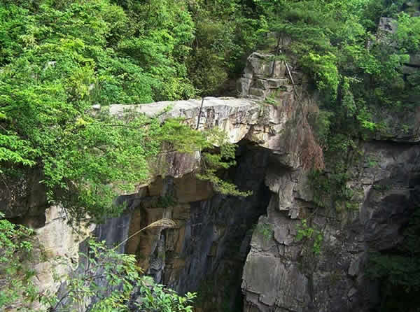 仙人橋又稱天下第一橋,坐落在猴子坡上、天子峰下的王爺洞對面。橋?qū)僮匀恍纬桑L26米,寬1.5米,厚一米多,高約六七十 米,飛架在兩岸懸崖絕壁之上,鬼斧神工,惟妙惟肖,古人云:“天地可掬,此真天造也”。仙人橋?yàn)榧t砂巖結(jié)構(gòu),兩端生有高大的黃山松和杜鵑樹,濃蔭掩映,極其美麗。橋的東頭還有自然形成的石級,人可順石級而下,走上天橋,下視萬丈深淵,令人頭暈?zāi)垦,非健壯者不敢逾越,旅游者無不贊嘆,說它是“天下絕景”。