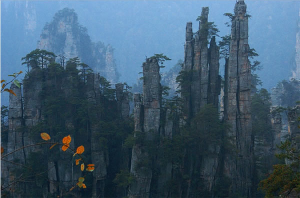 從仙人橋去老屋場,但見深谷里密密麻麻羅列上百座石峰,活像一群威武雄壯的將士列隊(duì)聽令,相傳這是向王天子的神兵在聚會。神話雖不可靠,但石峰如此集中壯觀,在武陵源也屬罕見。我想引用一位美術(shù)大師的話:“豈有此理,莫名其妙,說也不信,到此方知”。不看神兵聚會,怎知石峰成林。