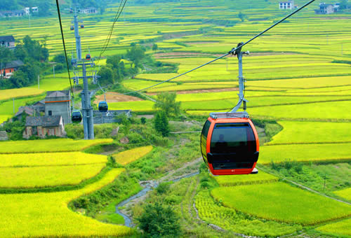 天門山索道途經(jīng)的美麗田園 天門山索道最大的亮點(diǎn)就是它的爬坡面支架的設(shè)計(jì) ,這個(gè)支架共有壓索輪96個(gè),托索輪16個(gè),它綜合了現(xiàn)代物理學(xué)、現(xiàn)代工程學(xué)、現(xiàn)代制造業(yè)中最先進(jìn)的理論和成果,應(yīng)用了世界最先進(jìn)的索道技術(shù),從而使這段索道總給人一種蕩氣回腸、氣勢沖天的感覺。