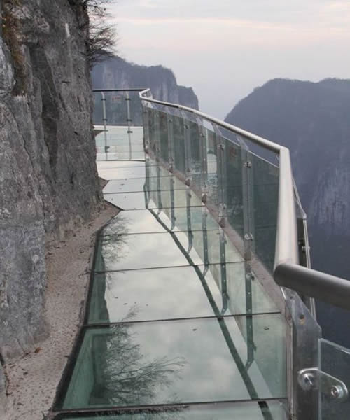 2011年10月1日,張家界天門(mén)山國(guó)家森林公園新建的玻璃棧道正式對(duì)游客開(kāi)放。玻璃棧道懸于天門(mén)山頂西線,長(zhǎng)60米,最高處海拔1430米。是張家界天門(mén)山景區(qū)繼懸于峭壁之上的鬼谷棧道、憑空伸出的玻璃眺望臺(tái)、從玻璃臺(tái)可以看見(jiàn)下面。玻璃臺(tái)伸出棧道有4-5米,專(zhuān)供游人拍照、橫跨峽谷的木質(zhì)吊橋后打造的又一試膽力作。為了讓游客零瑕疵的透過(guò)玻璃橋看到美麗的風(fēng)景,上橋的游客均要求戴上鞋套,以保持玻璃橋的透明和干凈。玻璃棧道的刺激震撼,可與舉世聞名的美國(guó)大峽谷玻璃走廊“天空之路”媲美,因而有了東方“天空之路”的美譽(yù)。