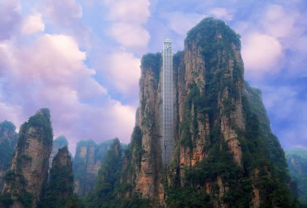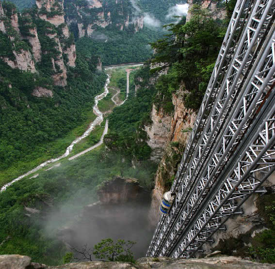 百龍電梯圖片 百龍?zhí)焯輾鈩莼趾,垂直高?35米,運行高度326米,由154米山體內堅井和172米貼山鋼結構井架等組成,采用三臺雙層全暴露觀光電梯并列分體運行,每臺次載客50人次,運行速度3米/秒,三臺同時運行每小時往返量達4000人次。百龍?zhí)焯莸男藿▽崿F“山上游,山下住”的目標,提供了交通保障,將袁家界天下第一橋、迷魂臺、天懸白練以及烏龍寨、楊家界等絕世美景從幕后推向了前臺,并將天子山、袁家界、金鞭溪等精品旅游線路連為一體,解決了多年困擾景區(qū)的交通瓶頸問題。