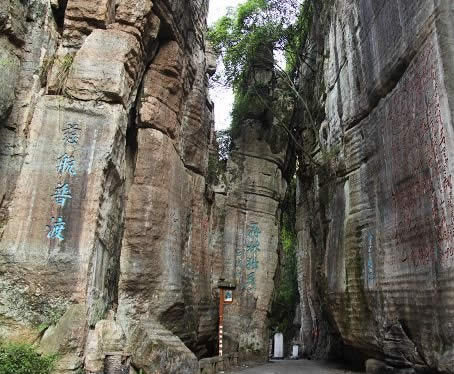 不二門 不二門風景區(qū)是一座國家級森林公園(二00六年八月三十一日,經(jīng)國家林業(yè)局批準,成為首批獲得中國國家森林公園專用標志使用授權(quán)的國家級森林公園),湖南省有名勝景。風景區(qū)位于縣城南1.5公里的猛洞河畔,總面積達30平方公里,是猛洞河風景區(qū)的北大門。以石奇、溫泉、石刻、觀音朝拜為其特色。石灰?guī)r溶蝕而成的不二石門、蓮花池、八陣圖被視為大自然的鬼斧神工。 一筆呵成的"山青海岸"四個字合成一個"岸"字的石刻、有迷魂鎮(zhèn)之稱的八陣圖令人驚嘆不已。這里一年四季蒼翠蔥蘢,梵聲繚繞,是修身養(yǎng)性的好地方!稙觚埳浇朔擞洝贰⑴c《相西剿匪記》均在此拍攝。 不二門取自佛家“不二法門”之意,正門的右壁上有沈從文先生題寫的“石門天鑿”四字,為沈先生生前最后一次回鄉(xiāng)時題寫。