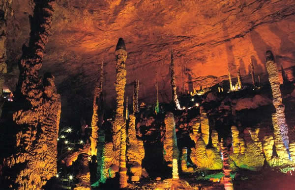 黃龍洞圖片 黃龍洞以立體的洞穴結(jié)構(gòu),龐大的洞穴空間,寬闊的龍宮廳及數(shù)以萬計的石筍,高大的洞穴瀑布,水陸兼?zhèn)涞挠斡[線等優(yōu)勢構(gòu)成了國內(nèi)外頗有特色的游覽洞穴,洞內(nèi)有1庫、2河、3潭、4瀑、13大廳、98廊,以及幾十座山峰,上千個白玉池和近萬根石筍。由石灰質(zhì)溶液凝結(jié)而成的石鐘乳、石筍、石柱、石花、石幔、石枝、石管、石珍珠、石珊瑚等遍布其中,無所不奇,無奇不有,仿佛一座神奇的地下“魔宮”。黃龍洞現(xiàn)已開放有龍舞廳、響水河、天仙瀑、天柱街、龍宮等6大游覽區(qū),主要景觀有定海神針、萬年雪松、龍王寶座、火箭升空、花果山、天仙瀑布、海螺吹天、雙門迎賓、滄海桑田、黃土高坡等100多個。