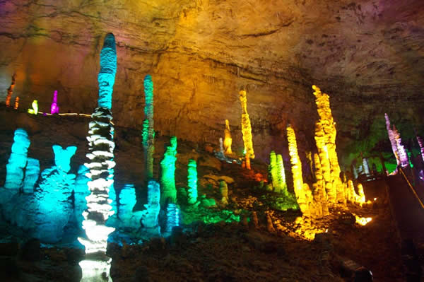 萬畝糧田 黃龍洞位于索溪峪東面,被稱為“地下魔宮”,洞口霧靄迷漫,洞內(nèi)長廊蜿蜒,鐘乳懸浮,石柱石筍林立,還有石簾、石幔、石花、石琴,琳瑯滿目,異彩紛呈,令人目不暇接!岸赐舛础薄ⅰ皹峭鈽恰、“天外天”、“山外山”,盤根錯節(jié)。黃龍洞內(nèi)可分四層,水陸并進,從最低陰河至最高穹頂,垂直高度差有100多米,洞內(nèi)有一個水庫(黃龍水洞)、二條陰河(響水河、水晶河)、三個地下瀑布(黃龍瀑、天水瀑、天地瀑)、四個水潭、十三個廳(宮)(龍舞宮、水晶宮、迷人宮……)、九十六條游廊,長度約達15公里,最大的廳堂有12000平方米,可容納萬人。真可謂是洞中乾坤大,地下有洞天。入黃龍洞,如入人間仙境一般。 |