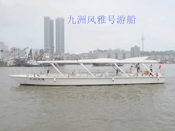 “九洲風(fēng)雅”號游船:船長23.08米,寬5.03米,擁有80客位。此船造型簡約,有很強(qiáng)的時尚設(shè)計感,與馬爾代夫的游船同款。