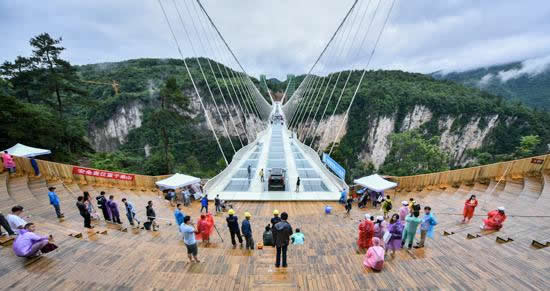 作為目前世界最高、最長人行玻璃天橋,張家界大峽谷玻璃橋創(chuàng)下了十項“世界之最”,堪稱國際橋梁建設的典范。其橋面由99塊全透明玻璃鋪設,遠看玻璃橋薄如蟬翼,“隱形”于山水天際之中,橋面總長430米、寬6米,距谷底相對高度約300米,游客走在橋上就可以清楚地看到腳下的懸崖峭壁,好似行在空中,非常刺激。